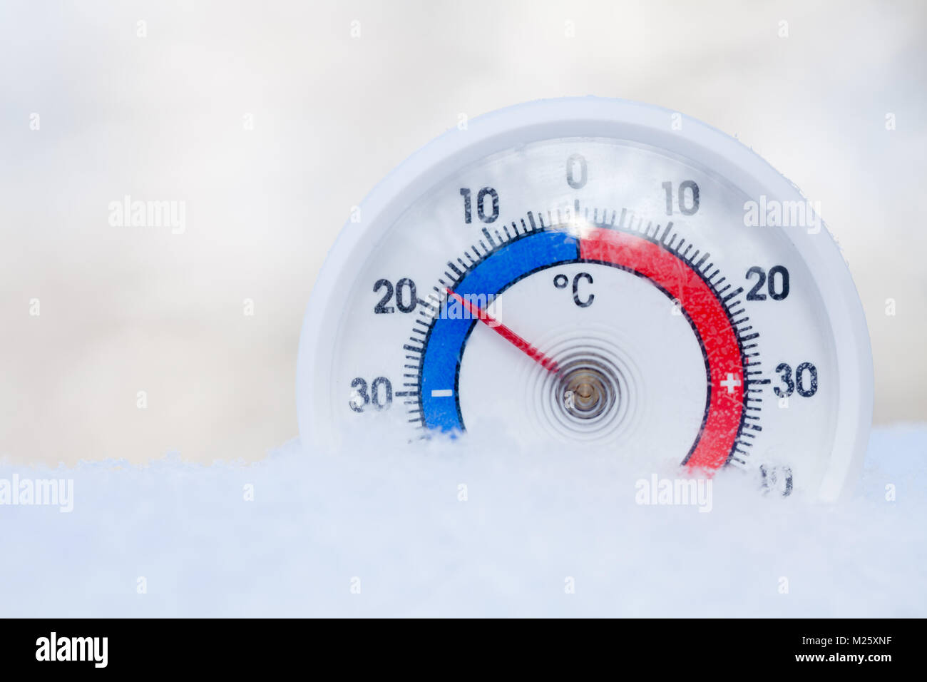 Termómetro con escala Celsius colocado en una nieve fresca mostrando subcero de 17 grados menos