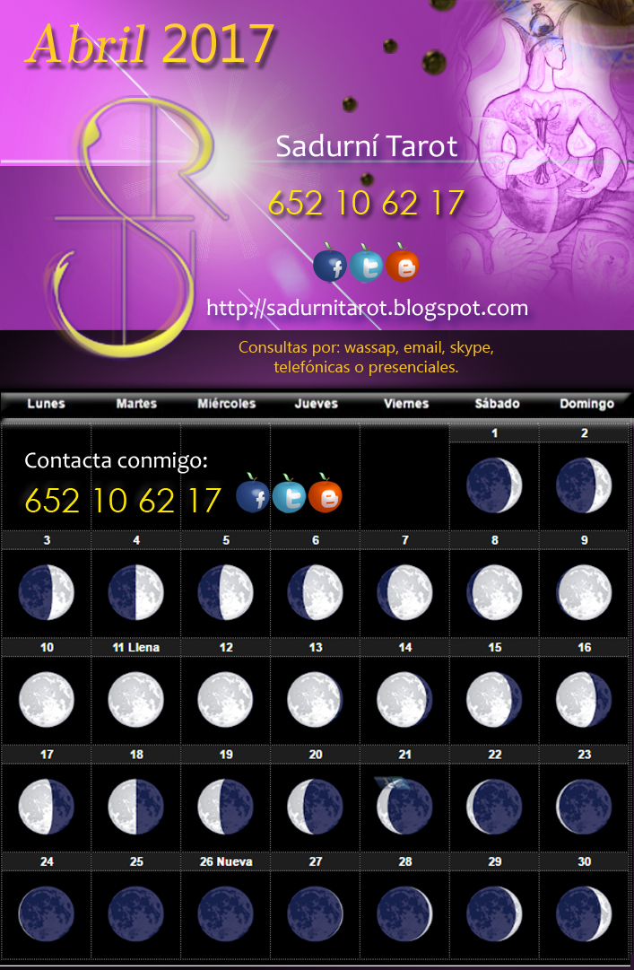 Sadurní Tarot Calendario Lunar, Abril 2017