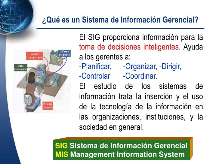 Sistema de información gerencial ( SIG; en inglés: management information system, MIS ), es un sistema de información basado en computadora, que presenta una colección de personas, procedimientos, bases. Los sistemas de información para la administración tienen como objetivo principal mostrar una visión general de la situación de la.