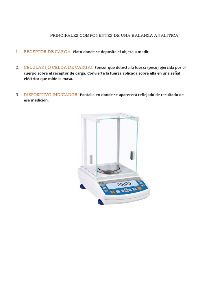 Componentes de la Balanza Analítica: 1. Plato de Pesaje: El plato de pesaje es la parte superior de la balanza donde se colocan las sustancias a medir. Está diseñado para minimizar la interferencia del aire y otros factores externos que podrían afectar la precisión de las mediciones. 2. Celda de Carga: La celda de carga es el corazón de.
