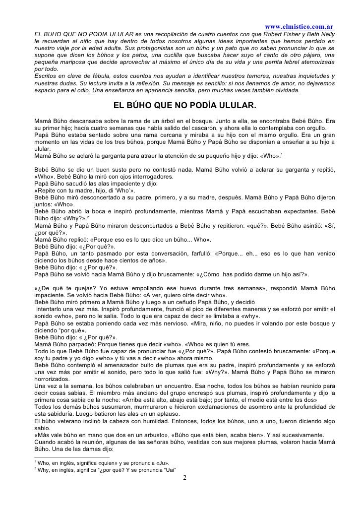 Una enseñanza en apariencia sencilla, pero muchas veces también olvidada. 1 fEL BÚHO QUE NO PODÍA ULULAR. Mamá Búho descansaba sobre la rama de un árbol en el bosque. Junto a ella, se encontraba Bebé Búho. Era su primer hijo; hacía cuatro semanas que había salido del cascarán, y ahora ella lo contemplaba con orgullo.