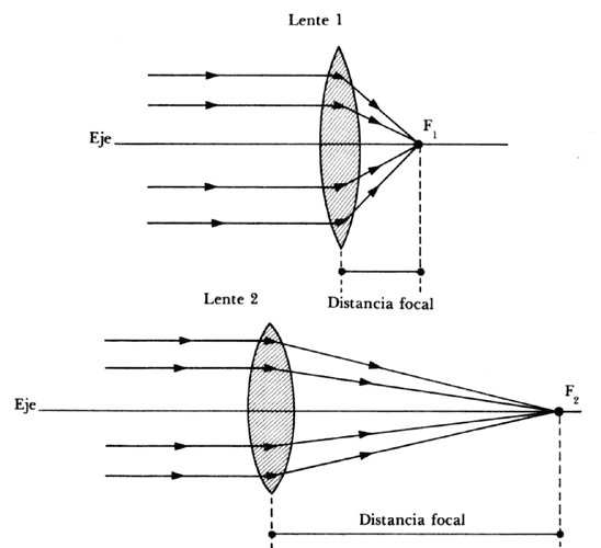 La inversa de la distancia focal de una lente es la potencia, y se mide en dioptrías. [1] Para una lente positiva (convergente), la distancia focal es positiva. Se define como la distancia desde el centro óptico de la lente (lugar por donde los rayos incidentes no son desviados) hasta el lugar donde un haz de luz de rayos paralelos al eje.