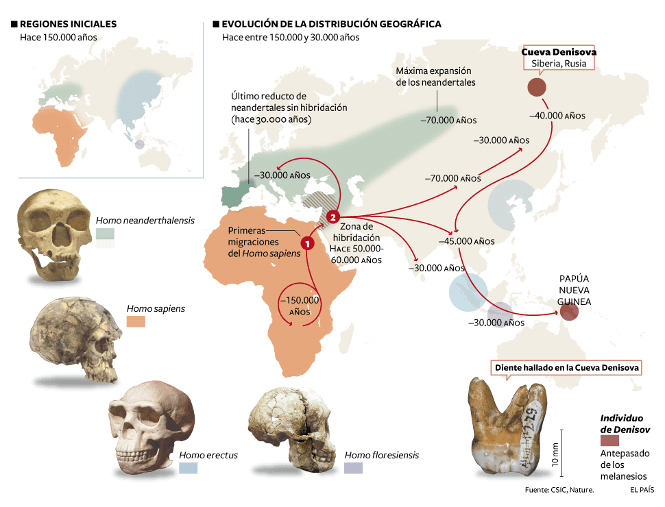 Ambas especies interaccionaron con los hombres modernos, Homo sapiens, ya que el 2 % de los genomas de los no africanos proviene de los hombres de Neandertal. Además, el 5 % de los genomas de las.
