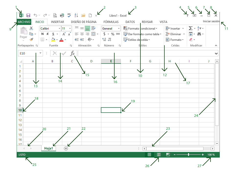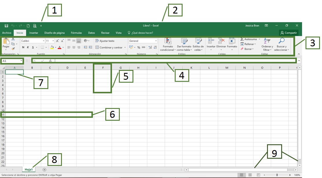 Veamos a continuación: 1. Libro de Excel. Nombre que se le da a los archivos de excel, los cuales están compuestos por una o varias hojas de cálculo. 2. Barra de Titulo. Está ubicada en la parte superior de la ventana, donde puedes encontrar el nombre del libro de excel que estás trabajando. 3.