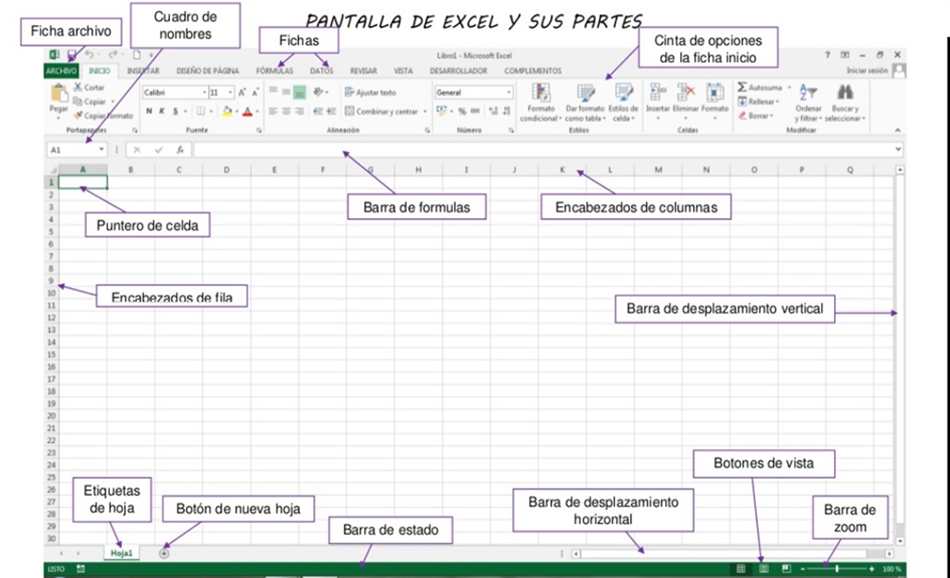 Cantidad y nombres de los elementos: Excel es una herramienta de hojas de cálculo que cuenta con una amplia variedad de elementos en su interfaz. A continuación, se mencionan algunos de ellos: Barra de herramientas de acceso rápido. Cinta de opciones. Barra de estado.