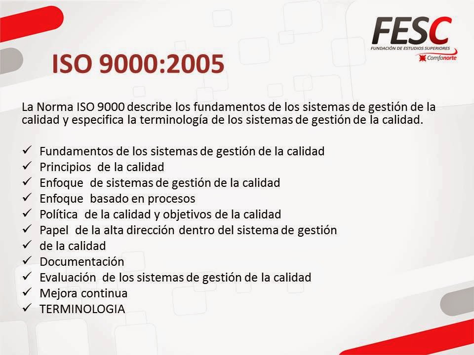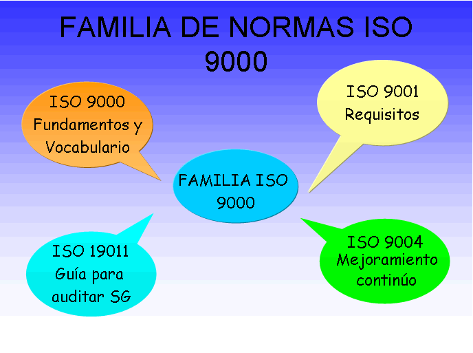 Familia ISO 9000. La familia ISO 9000 la constituyen, principalmente, cuatro grandes normas. Estas se rodean de otra serie de normas de apoyo, los llamados documentos orientadores y diferentes informes técnicos. Las anteriormente mencionadas normas principales son la norma ISO 9000:2015 Sistemas de gestión de calidad, fundamentos y.