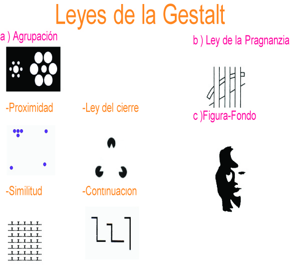Más leyes y principios de la Gestalt. Otras leyes de la teoría de la Gestalt son: La ley de la figura-fondo: no podemos percibir una misma forma como figura y a la vez como fondo de esa figura. El fondo es todo lo que no se percibe como figura. Ley de la continuidad: si varios elementos parecen estar colocados formando un flujo orientado.
