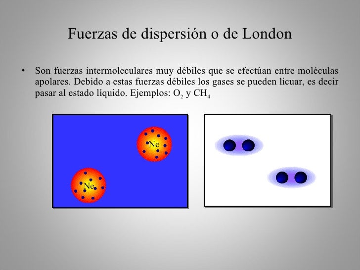 Fuerzas de dispersión. Las fuerzas de dispersión o de London son un tipo de fuerza intermolecular de Van der Waals. Las fuerzas de dispersión ocurren entre moléculas apolares, aunque también se dan en moléculas polares, solo que comparadas con las fuerzas dipolo-dipolo son muy pequeñas.