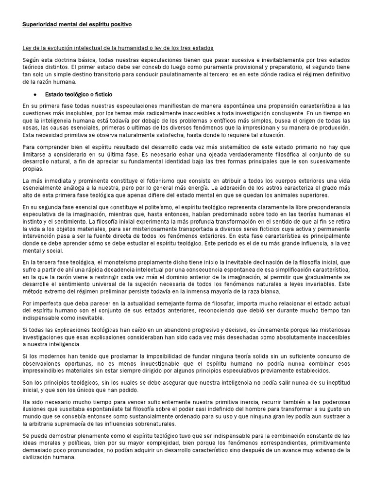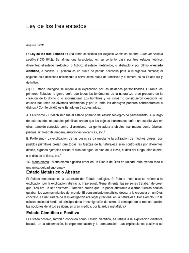 View PDF. Augusto Comte y los 3 estados La Ley de los tres estados es una teoría concebida por Auguste Comte en su obra Curso de filosofía positiva (1830-1842). Se afirma que la sociedad en su conjunto pasa por tres estados teóricos diferentes: el estado teológico, o ficticio; el estado metafísico, o abstracto y por último el estado.