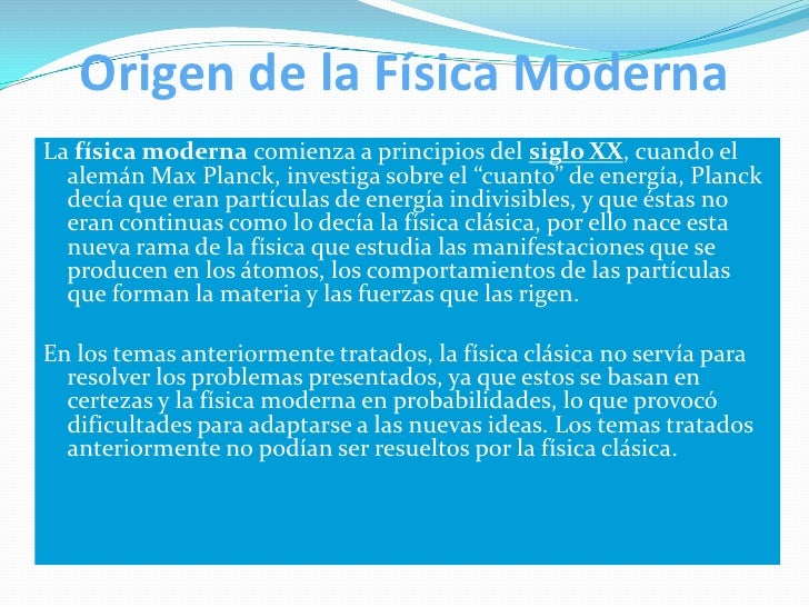FUNDAMENTOS DE LA FISICA MODERNA. La física moderna comienza a principios del siglo XX, cuando el alemán Max Planck, investiga sobre el "cuanto" de energía,Planck decía que eran partículas de energía indivisibles, y que éstas no eran continuas como lo decía la física clásica, por ello nace esta nueva rama de la física que estudia.