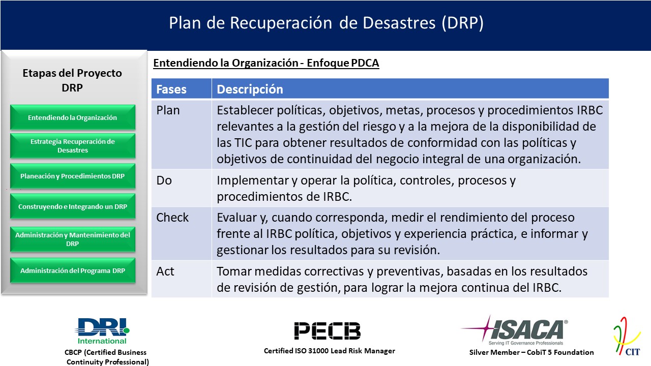 Incluye medidas de prevención y mitigación de riesgos, planes de respuesta a emergencias y estrategias de recuperación. Un plan de recuperación ante desastres es un componente del plan de continuidad de negocios que se ocupa específicamente de los procedimientos necesarios para que cada parte del negocio vuelva a funcionar después de un.