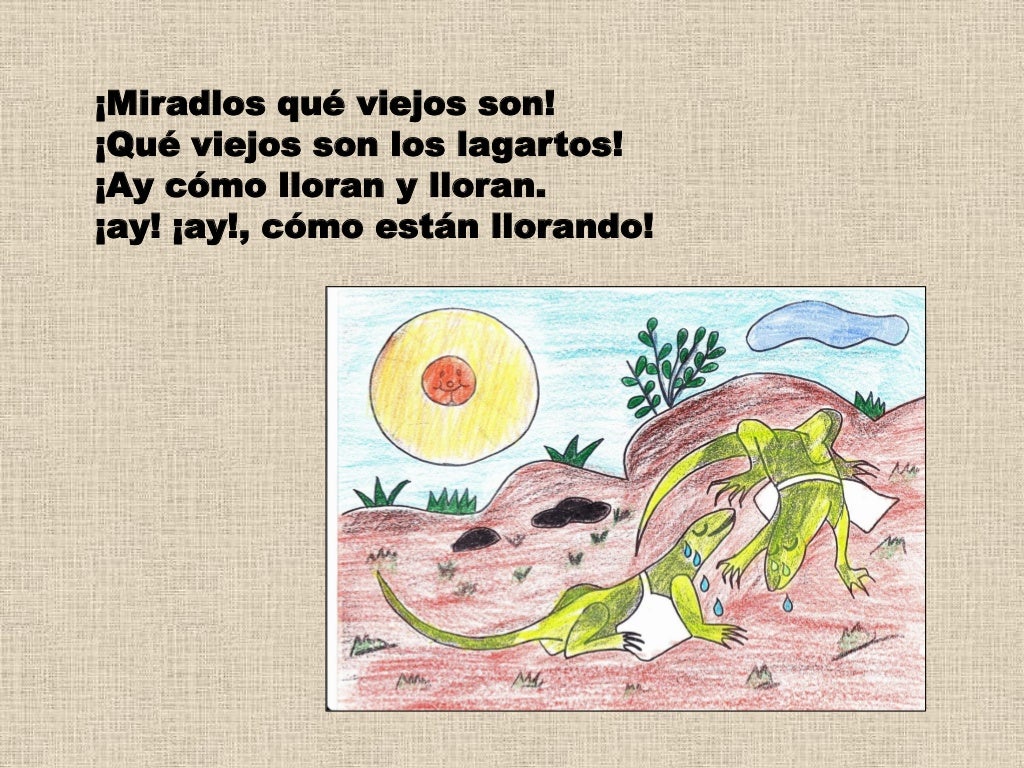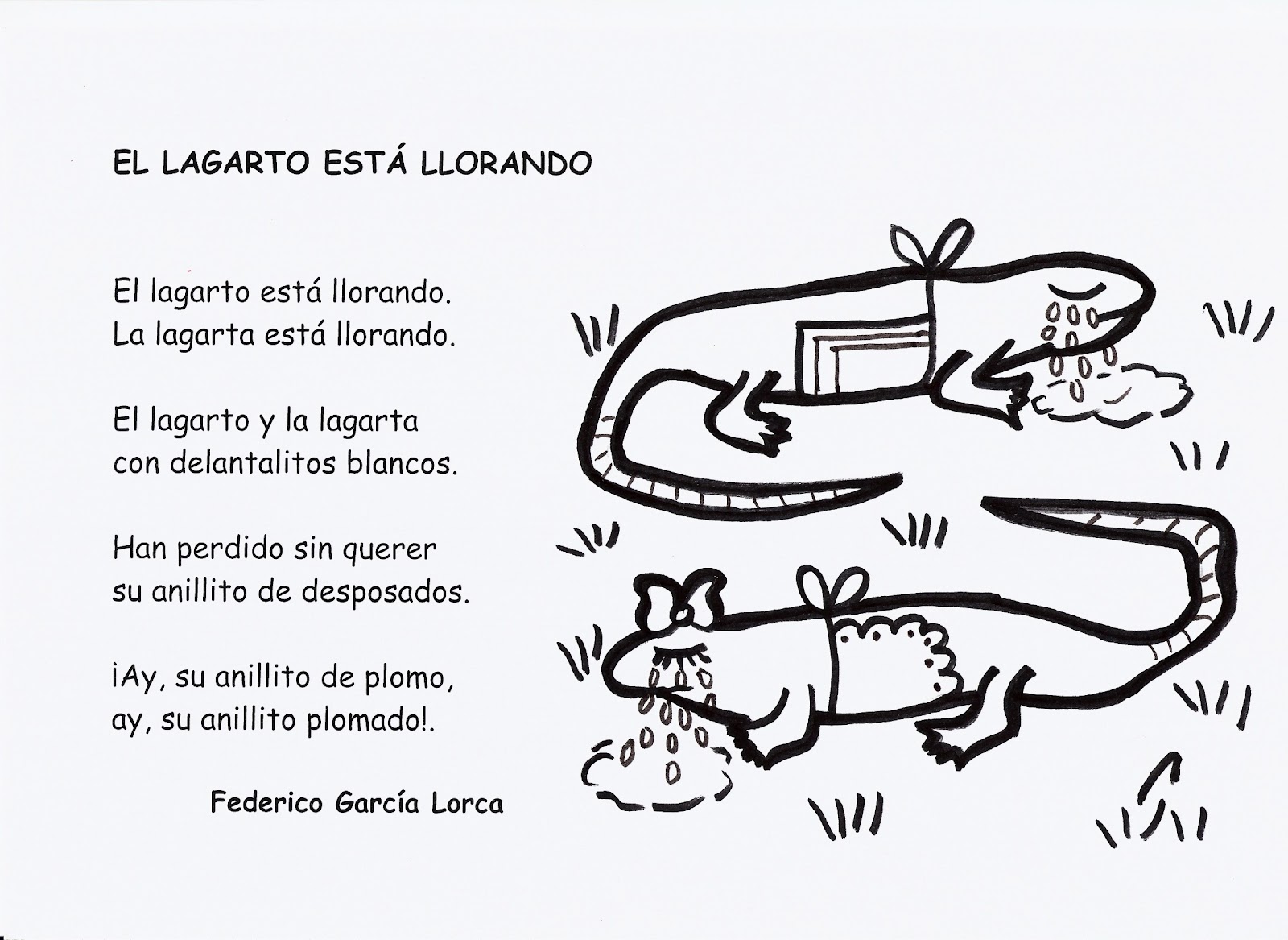 Poesía infantil: El lagarto está llorando. El lagarto está llorando. La lagarta está llorando. El lagarto y la lagarta con delantalitos blancos. Han perdido sin querer su anillo de desposados. ¡Ay! su anillito de plomo, ¡ay! su anillito plomado. Un cielo grande y sin gente. monta en su globo a los pájaros.