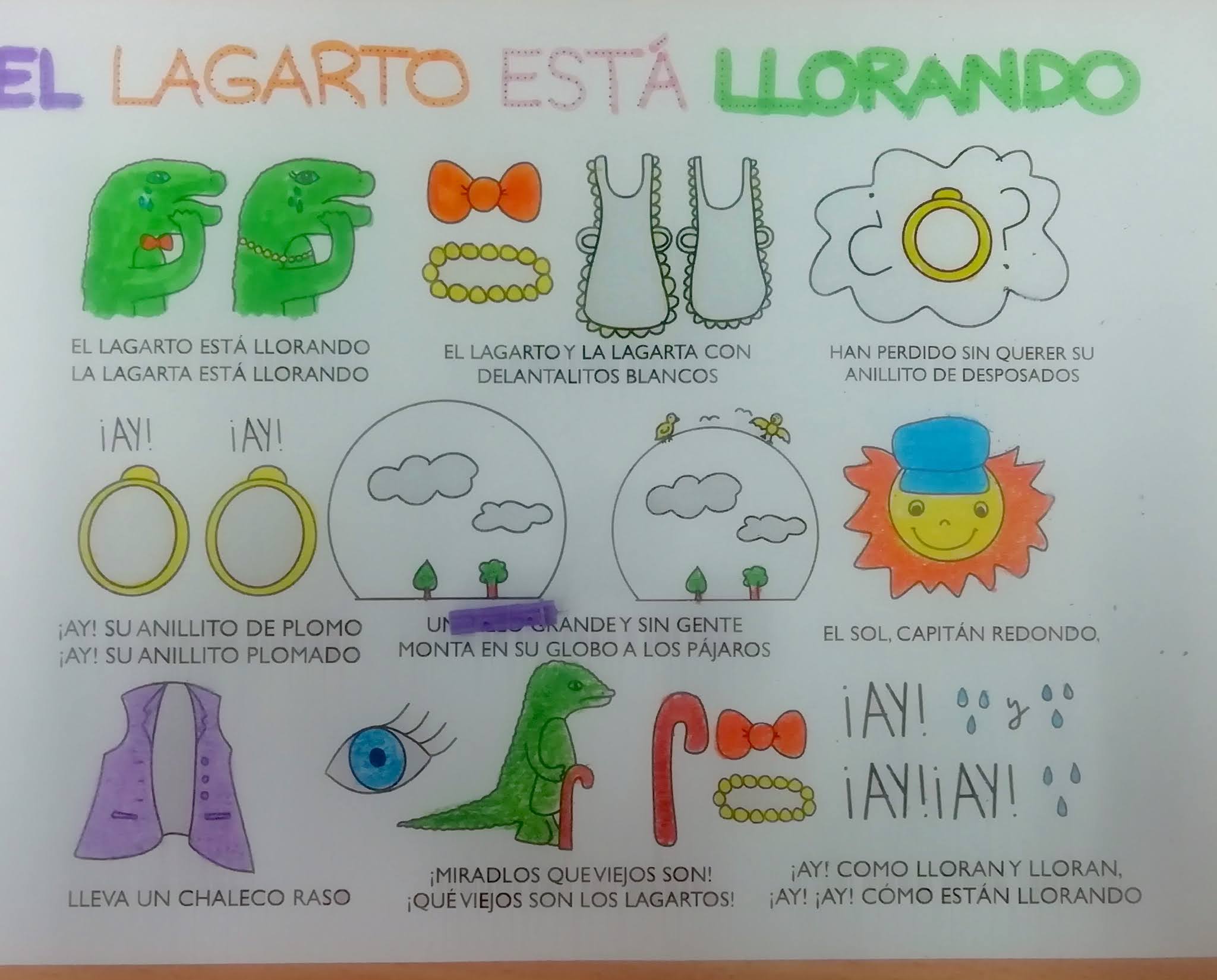 La lagarta está llorando. El lagarto y la lagarta. con delantalitos blancos. Han perdido sin querer. su anillo de desposados. ¡Ay, su anillito de plomo, ay, su anillito plomado!. Usa el poema para trabajar la memoria: Y por último, puedes pedir a los niños que memoricen este poema. Es corto y muy sencillo y para ellos será un trabajo.