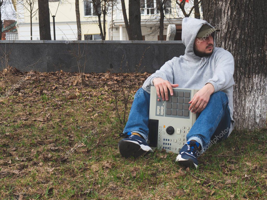 Un beatmaker del hiphop se sienta en la hierba en un parque debajo de un árbol que sostiene una