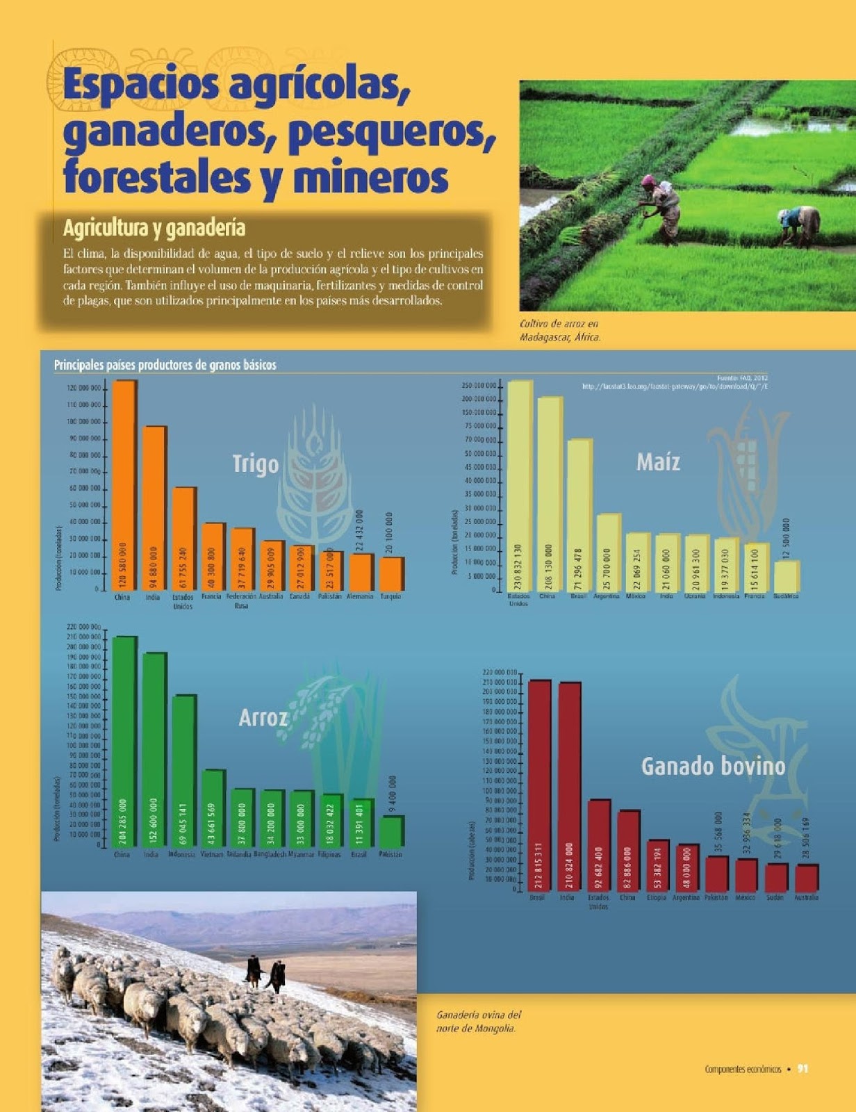 Producción ganadera, pesquera y forestal Distribución de espacios agrícolas, ganaderos, pesqueros y forestales en el mundo Agricultura: cultivo de cereales, frutas, hortalizas, pastos y forrajes como alimento para los seres humanos, ganado y materias primas para la industria. Las.