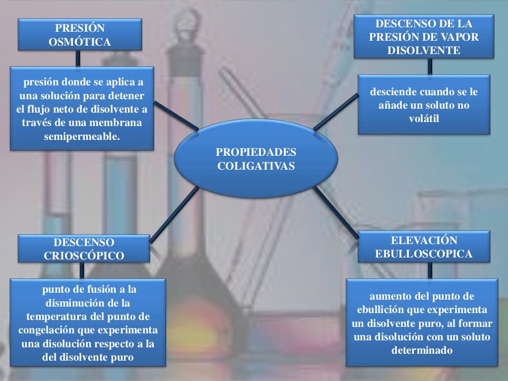 En este artículo, te explicaremos las 4 propiedades coligativas fundamentales y su teoría. 1. Descenso crioscópico. El descenso crioscópico es una propiedad coligativa que se refiere al descenso de la temperatura de congelación de una solución en comparación con la de su solvente puro. Esto se debe a que las partículas disueltas en la.