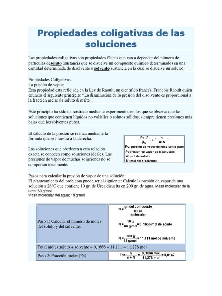 Resumen. Las propiedades de una solución que dependen únicamente de la concentración de partículas de soluto se denominan propiedades coligativas. Incluyen cambios en la presión de vapor, punto de ebullición y punto de congelación del disolvente en la solución.