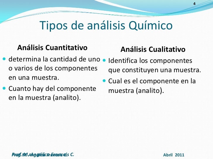 El Análisis Cualitativo revela la identidad de cada elemento y compuesto que forma una muestra. Y la Química Analítica Cuantitativa trata de desarrollar métodos para identificar la concentración de cada sustancia que presente en una muestra.. Sin embargo, ¿qué es la quimica analitica cuantitativa ejemplos? Por ejemplo.Calcio, Ca , Ca ++ , CaCl2 , proteínas, grasas, carbohidratos.