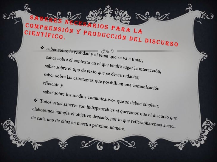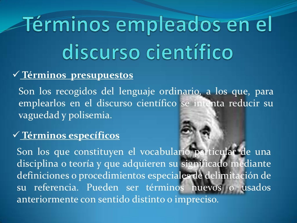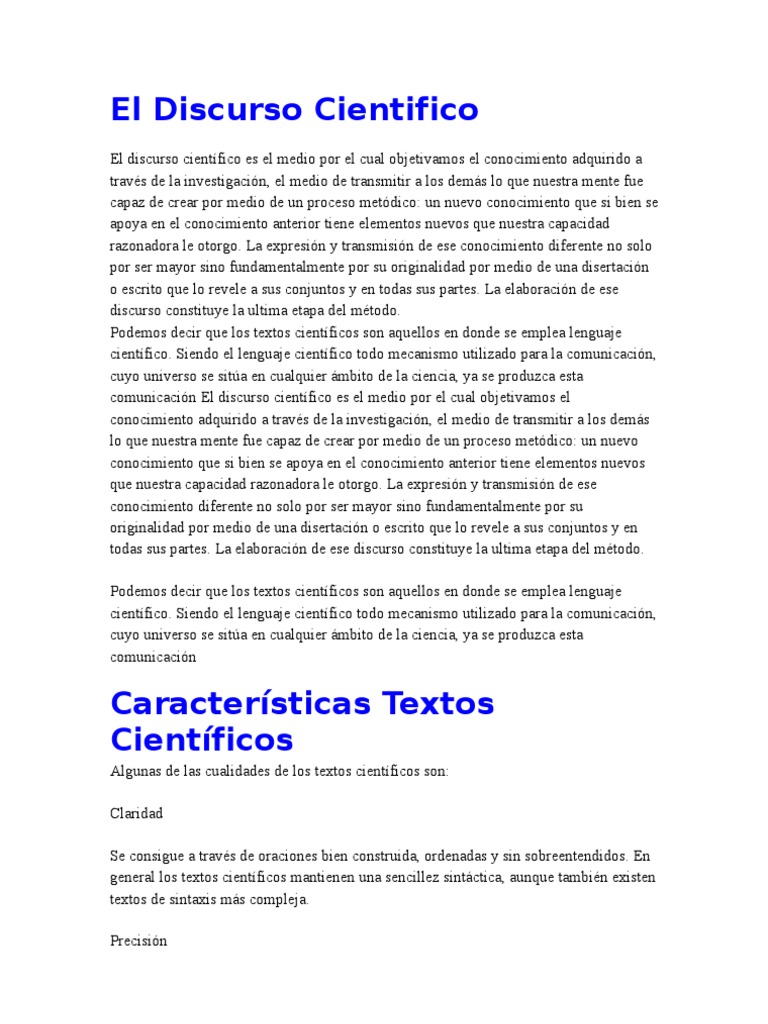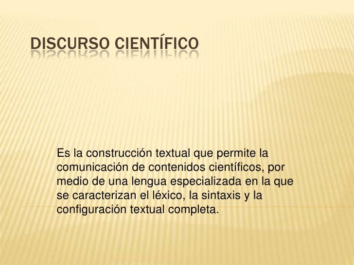 El discurso científico data de bastantes siglos. El discurso científico (del latín discursus ['acción de correr de una parte a otra']) es la construcción textual que permite la comunicación de contenidos científicos por medio de una lengua especializada en un formato técnico, en la que se caracterizan el léxico, la sintaxis y la.