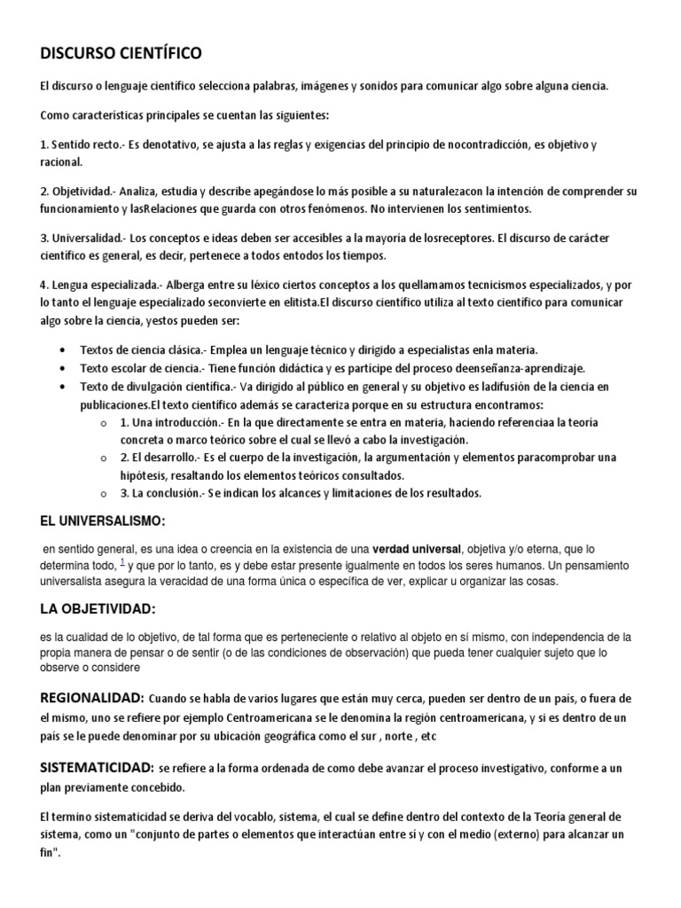 El discurso científico tiene un propósito comunicativo, es por este hecho que es fundamental conocer y comprender su significado, su origen, las características, sus funciones, su lenguaje, sus relaciones retóricas, su estructura, su tipología, las variables, y los aspectos relevantes que se deben atender para su correcta redacción.