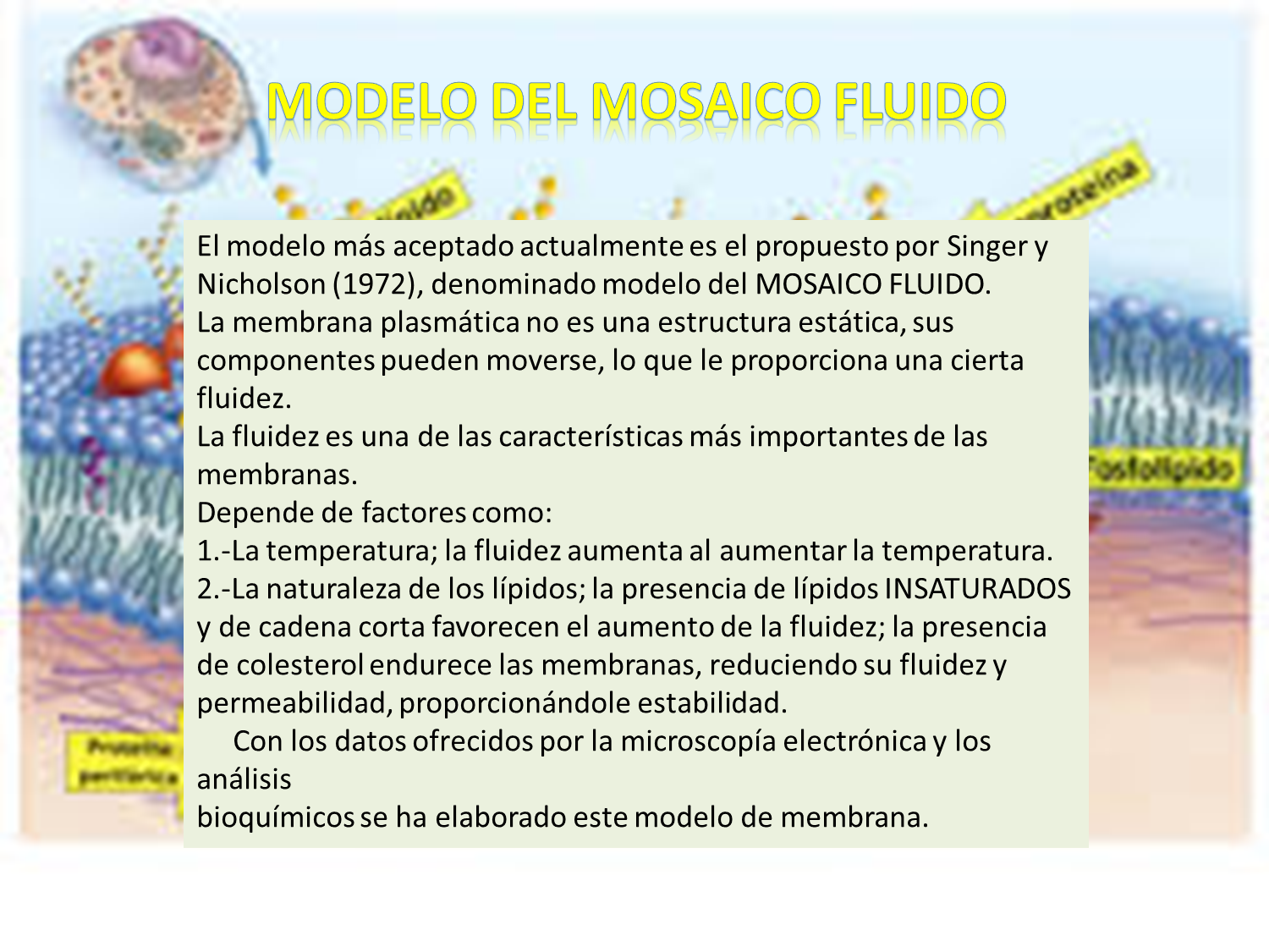 Según el modelo de mosaico fluido (Singer y Nicholson, 1972), la estructura básica de la. temperatura que es característica de cada membrana las moléculas de los lípidos comienzan a moverse y la membrana pasa al estado fluido. Por otra parte, el colesterol, debido a la rigidez del sistema de anillos condensados de su molécula,.