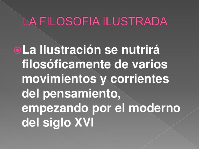Filosofía de la Ilustración. 16 de diciembre de 2008 Publicado por Malena. La Ilustración expresa, el pensamiento progresista previo a la revolución francesa. El elemento central de la Ilustración fue el predominio de la razón; que en los siglos XVII y XVIII se consolidó como un movimiento intelectual en Europa; que transformó las ideas.